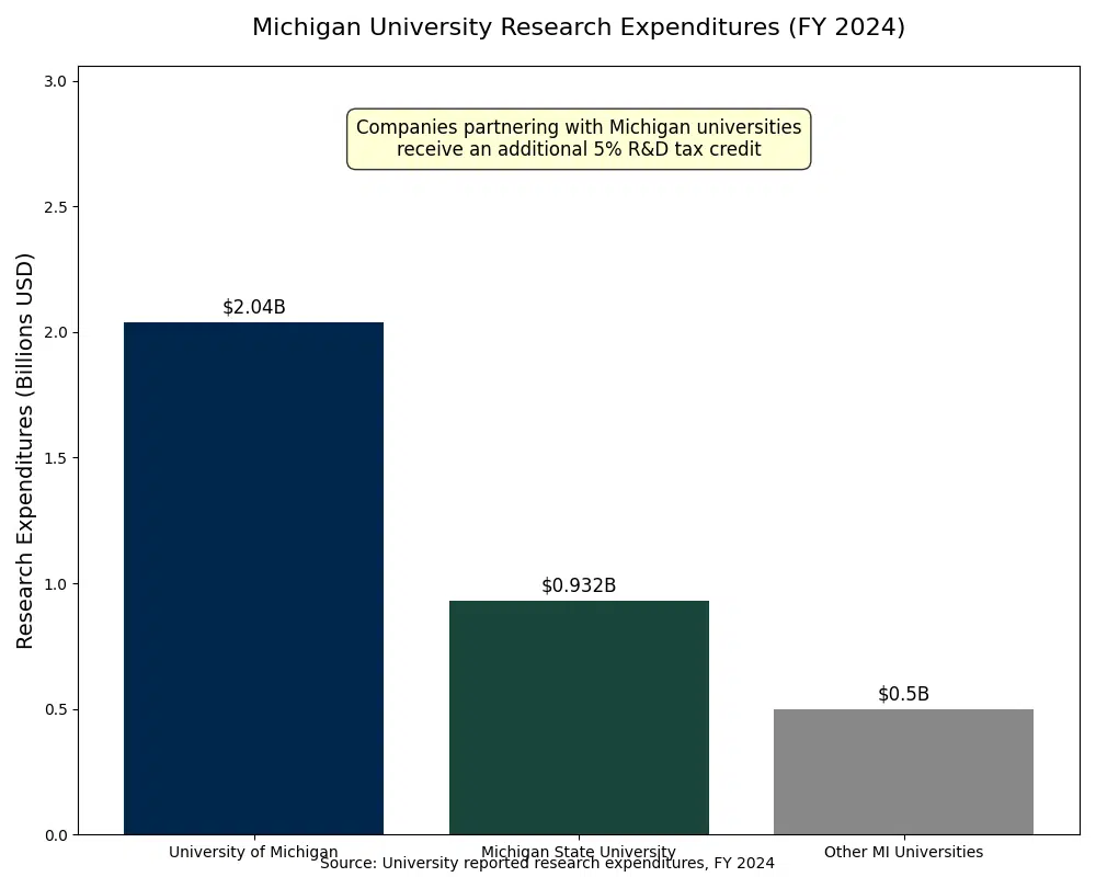 Michigan's world-class universities are key collaborators in the state's R&D ecosystem. The University of Michigan reported a record $2.04 billion in research expenditures in fiscal year 2024, while Michigan State University reported $932 million for the same period. These institutions are poised to be important partners for businesses looking to maximize their R&D tax credit through the 5% additional credit for university collaborations.